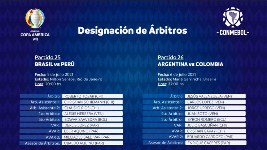 A menos de 24 horas de que comiencen las semifinales de la Copa América, la Conmebol dio a conocer las designaciones arbitrales para los partidos que protagonizarán Brasil y Perú, el lunes, y Argentina y Colombia, el martes.