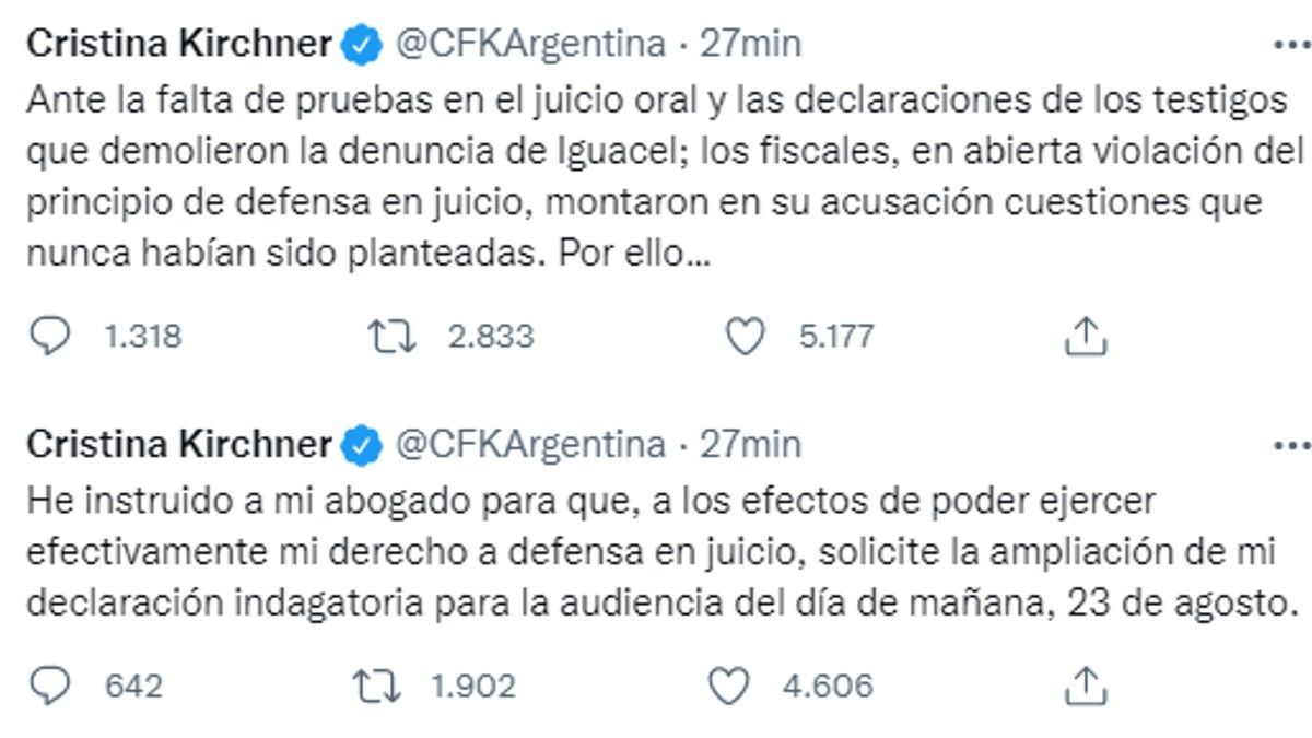 La vicepresidenta Cristina Kirchner reaccionó en su cuenta de Twitter tras conocerse la información de que el tribunal rechazó su pedido para ampliar su indagatoria este martes.