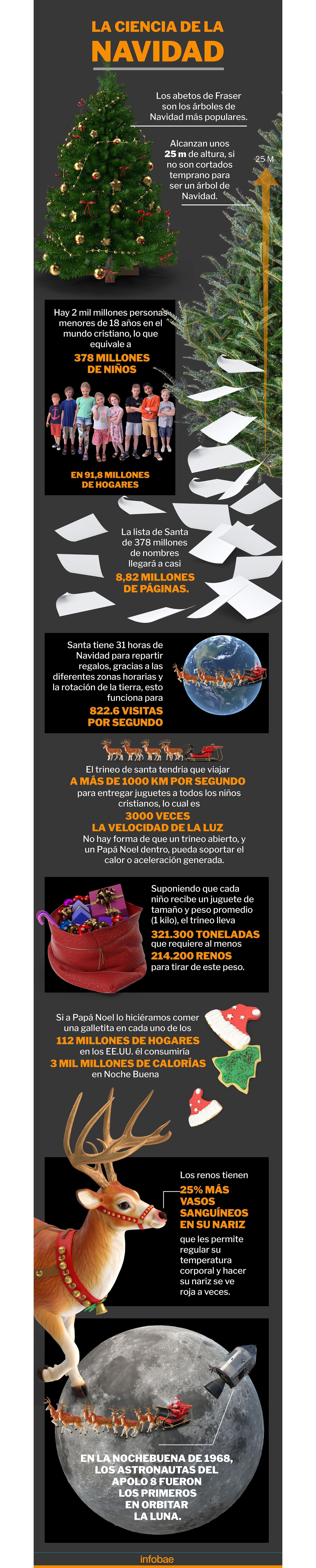 Los cálculos sobre el desplazamiento de trineo de Santa ClausEn tren de seguir sumando información, los científicos buscaron también responder cuántas cartas recibió previamente a la Nochebuena, con cuántas horas cuenta para distribuir los regalos, cuál es su velocidad promedio de reparto, cuánto pesa su bolsa de regalos, cuántas galletitas que le dejan los niños podría llegar a comer, porqué el reno Rodolfo tiene la nariz roja y quiénes fueron los humanos que orbitaron la Tierra un 24 de diciembre y podrían haber llegado a verlo.