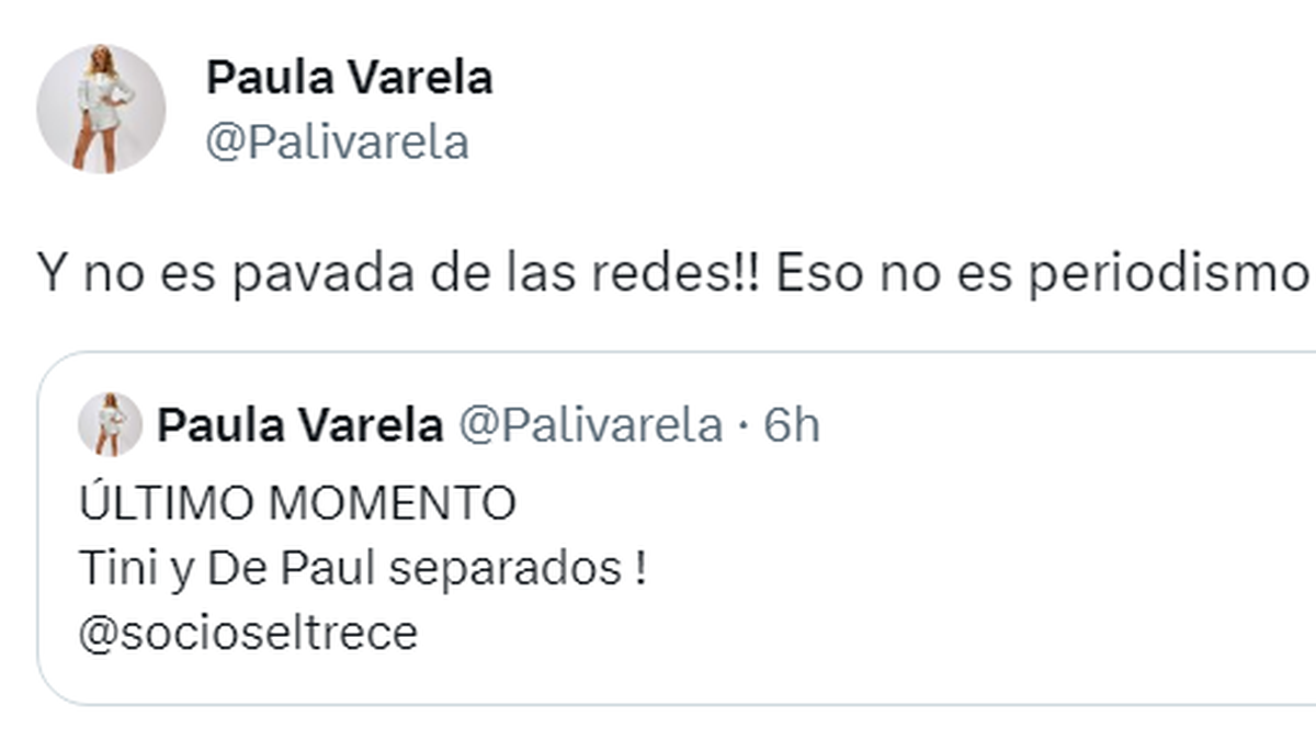 ÚLTIMO MOMENTO, Tini Stoessel y Rodrigo De Paul separados», escribió Paula en un primer tweet y luego agregó picante: «Y no es pavada de las redes!! Eso no es periodismo Esto es Información!»