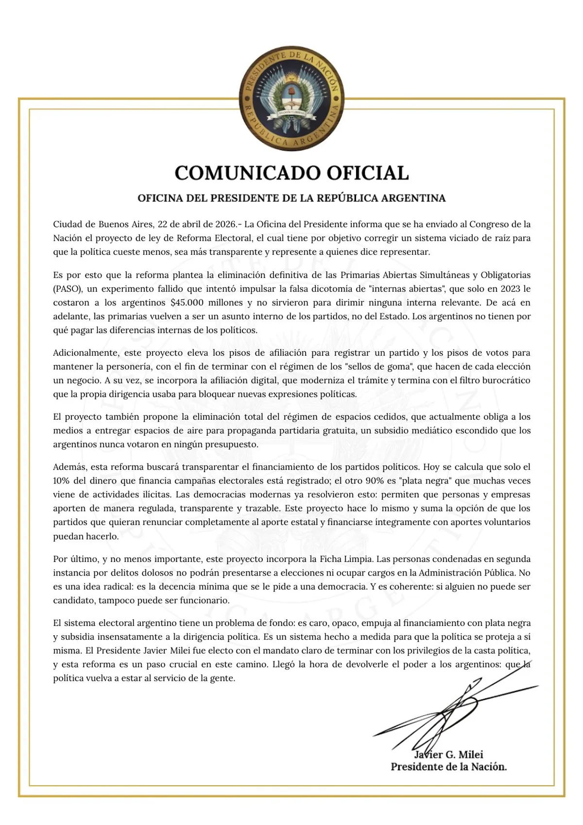 El Gobierno envió al Congreso un proyecto de reforma electoral que propone eliminar las PASO, incorporar Ficha Limpia para candidatos y modificar de manera integral el funcionamiento de los partidos políticos, el sistema de votación y el financiamiento de la política. La Oficina del Presidente señaló que la reforma «tiene por objetivo corregir un sistema viciado de raíz para que la política cueste menos, sea más transparente y represente a quienes dice representar«.