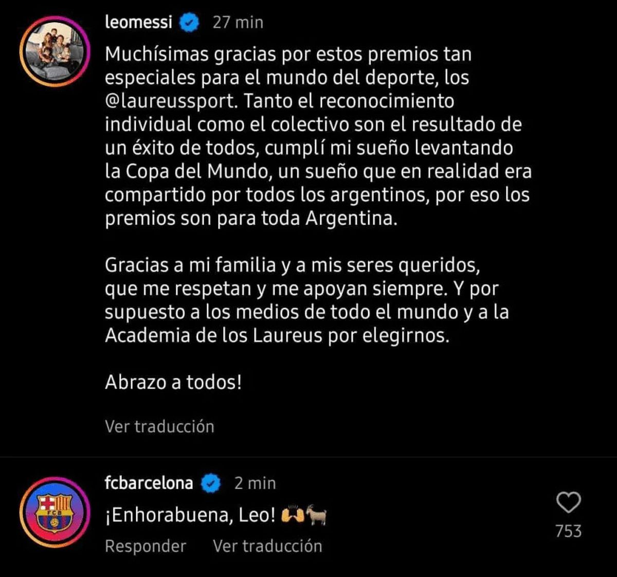 «Muchísimas gracias por estos premios tan especiales para el mundo del deporte», fue lo primero que escribió la Pulga en su cuenta de Instagram. Además, afirmó que «tanto el reconocimiento individual como el colectivo son el resultado de un éxito de todos» y añadió: «Cumplí mi sueño levantando la Copa del Mundo, un sueño que en realidad era compartido por todos los argentinos, por eso los premios son para toda Argentina».