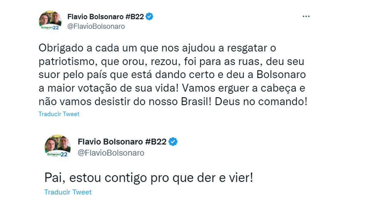 «¡Gracias a todos los que nos ayudaron a rescatar el patriotismo, que rezaron, rezaron, salieron a las calles, sudaron por el país que está trabajando y le dieron a Bolsonaro el voto más grande de su vida! ¡Renunciar a nuestro Brasil! ¡Dios al mando!». , dijo Flávio, sin mencionar a Lula.