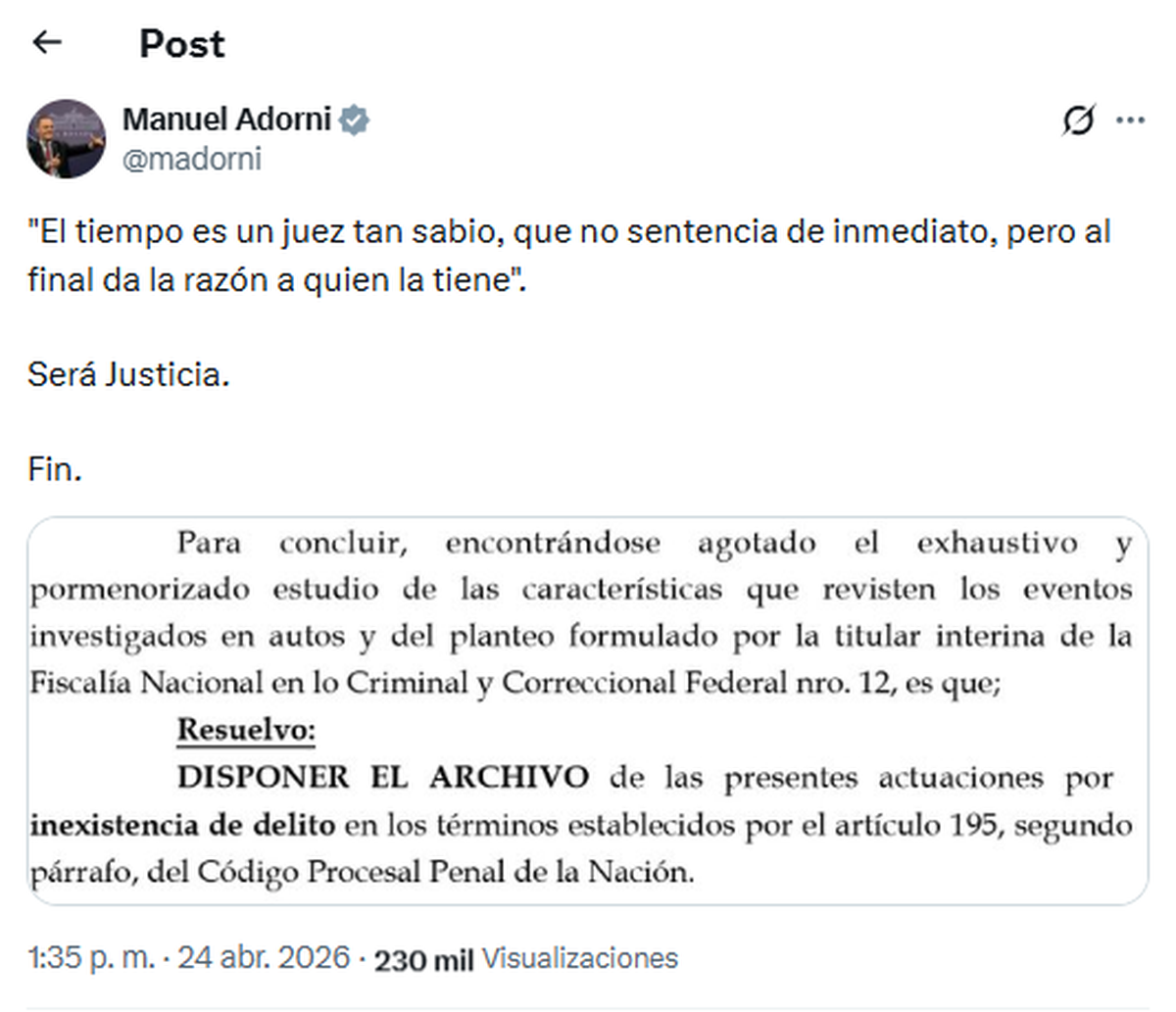 El jefe de Gabinete, Manuel Adorni, se pronunció tras conocerse la decisión judicial y publicó un mensaje contundente en su cuenta de X. “El tiempo es un juez tan sabio, que no sentencia de inmediato, pero al final da la razón a quien la tiene. Será Justicia. Fin”, escribió.