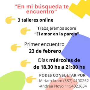 Te invitamos a participar de un ciclo de 3 talleres online donde se trabajara sobre “El amor en la pareja”.