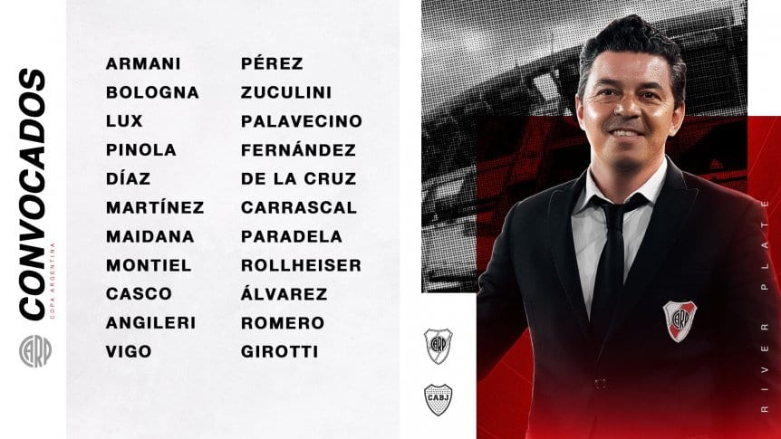 Franco Armani; Gonzalo Montiel, Paulo Díaz, Héctor Martínez, Fabrizio Angileri; Bruno Zuculini, Enzo Pérez, José Paradela o Jorge Carrascal; Nicolás De la Cruz, Braian Romero y Julián Álvarez.